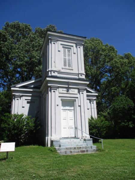 | Bethel Church c. 1845, Greek Revival The original congregation of Bethel Presbyterian Church, organized in 1826 under the direction of Dr. Jeremiah Chamberlain, contracted this building in the mid-1840's. On the interior, ornamentation is completely lacking. The use of pilesters on the exterior is an interesting feature, as are the simplified hood moulds. Normally found only on Gothic Revival buildings. Renovations of the interior have occurred over the years and the original slave gallery has been removed. A tornado [in the 1940's] destroyed the sharply pointed steeple. |