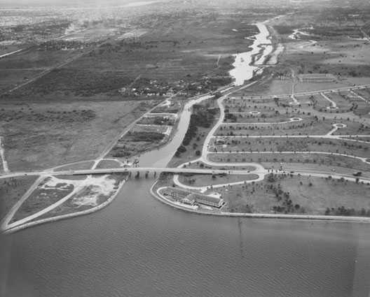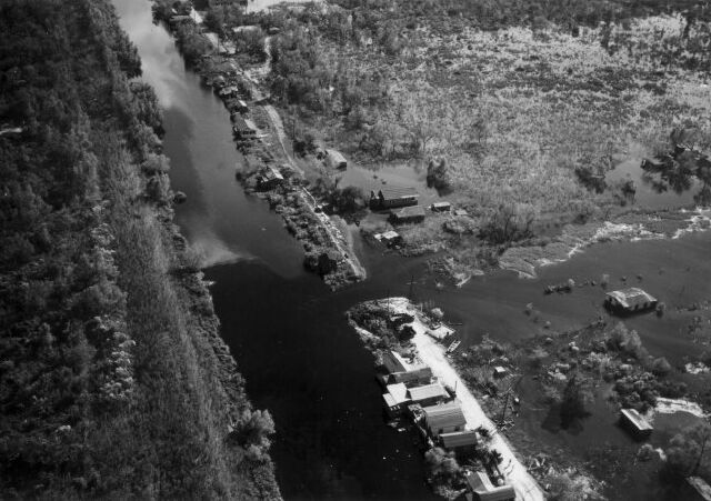 An aerial view of the 17th Street Canal after a breach during the 1947 hurricane. The canal is a dividing line for Orleans and Jefferson parishes, in this photo, the New Orleans side is on the left and the breach occurred on the Jefferson Parish side on the right. After Hurricane Katrina, a failure occurred on the Orleans Parish side, in the Lakeview neighborhood, and was responsible for flooding a large part of the city. As you can see in this 1947 photo neither of the areas which abutted the canal in either parish were densely populated at that time. By 2005, when Hurricane Katrina struck the city, that had changed. New Orleans' Lakeview neighborhood was particularly devastated by the breach. |