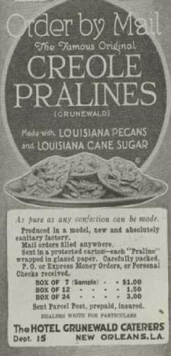 | Produced in a model, new and absolutely sanitary factory. Mail orders filled anywhere. Sent in a protected carton--each "Praline" wrapped in glazed paper. Carefully packed. Hotel Grunewald Caterers Box of 7.....$1.00 Box of 12....1.50 Box of 24....3.00 |
