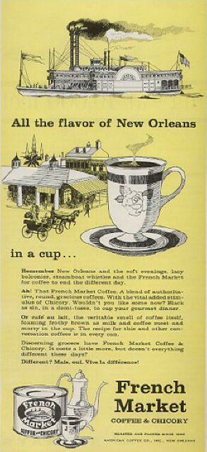 | "Remember New Orleans and the soft evenings, lazy balconies, steamboat whistles and the French Market for coffee to end the different day? Ah! That French Market Coffee. A blend of authoritative, round, gracious coffee. With the vital added stimulus of Chicory. Wouldn't you like some now? Black as sin, in a demi-tasse to cap your gourmet dinner. Or Cafe au Lait, the veritable smell of coffee itself, foaming frothy brown as milk and coffee meet and marry. The recipe for this and other conversation coffees is in every can. Discerning grocers have French Market Coffee and Chicory. It costs a little more, but doesn't everything different these days? Different? Mais oui. Vive la difference!" |