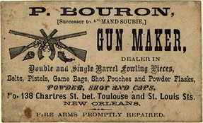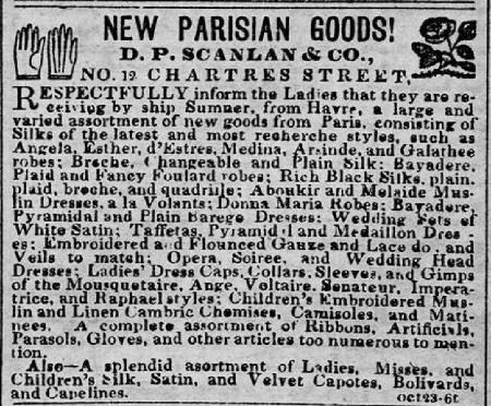 | 1853 Daily Delta ad: "New Parisian Goods! D. P. Scanlan & Co., No. 12 Chartres Street Respectfully inform the Ladies that they are receiving by ship Sumner, from Havre, a large and varied assortment of new goods from Paris, consisting of Silks of the latest and most rechereche styles, such as Angela, Esther, d'Estres, Medina, Arinde, and Galathee robes; Breche, Changeable and Plain Silk; Bayadere, Plaid and Fancy Foulard robes; Rich Black Silks, plain, plaid, breche and quadrule; Aboukir and Melaide Muslin Dresses, a la Volants; Donna Maria Robes; Bayadere, Pyramidal and Plain Barege Dresses; Wedding Sets of White Satin; Taffetas, Pyramid and Medaillon Dresses; Embroidered and Flounced Gauze and Lace and Dresses; Ladies' Dress Caps, Collars, Sleeves, and Gimps of the Mousquetaire, Ange, Voltaire, Senateur, Imperatrice, and Raphael styles; Children's Embroidered Muslin and Linen Cambrie Chemises, Camisoles, and Matinees. A complete assortment of Ribbons, Artificials, Parasols, Gloves, and other articles too numerous to mention. Also, a splendid assortment of Ladies, Misses and Children's Silk, Satin, and Velvet Capotes, Bolivards, and Capelines." |