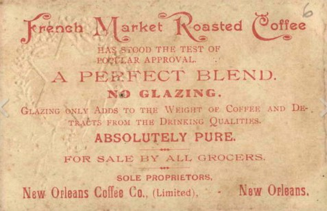 | French Market Roasted COffee Has stood the test of popular approval A perfect blend - No Glazing Glazing only adds to the weight of coffee and detracts from the drinking qualities Absolutely pure For sale by all grocers Sole proprietors, New Orleans Coffee Co. |