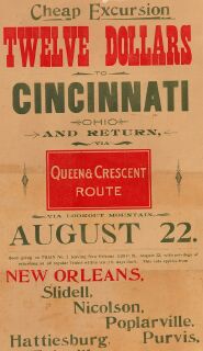 | "Cheap Excursion, Twelve Dollars, Cincinnati, Ohio and Return, Queen & Crescent Route, New Orleans, Slidell, Nicolson, Poplarville, Purvis, Hattiesburg." Date Unknown |