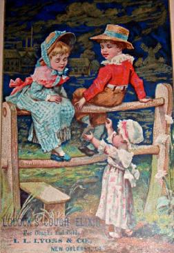 | Locock's Cough Elixir, 1884 The ad reads: "There is no disease which demands closer attention that a cold. At first it seems trifling, but if allowed to run on it frequently terminates in consumption. For the treatment of coughs, colds, hoarseness, bronchitis, sore throat, whooping cough and croup, there is no more valuable remedy than Locock's Cough Elixir. It is not an opiate and can be given with perfect safety to children. Manufactured by I. L. Lyons & Co., New Orleans." |