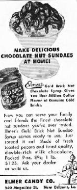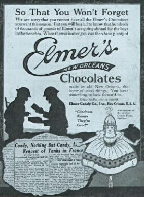| Elmer's Candy Co. Ad on the left was printed during WWI: "We are sorry that you cannot have all the Elmer's Chocolates you want this season. But you will be glad to know that hundreds of thousands of pounds of Elmer's are going abroad for the boys in the trenches. When the war is over, you can then have plenty of Elmer's Chocolates made in old New Orleans, the home of good things." Ad in center is ca. 1953 and ad on right is from 1949. |