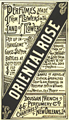 | ORIENTAL ROSE Perfume Made from Flowers in the Land of Flowers Put up in handsome glass stopper bottles at 50 cts, 75 cts, $1.00 and $2.00. Demand them of your druggist or send the money to us and we will send them prepaid. Sample of above and 11 other specialties sent to any address on receipt of 20 cts in stamps. Doussan French Perfumer Co. 46 Chartres Street, New Orleans, La. |