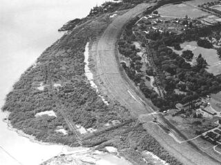 Aerial view of Audubon Park-the zoo can be seen in the upper right corner-on the left is the Mississippi River; this was taken to show construction of a new levee, 1937. |
