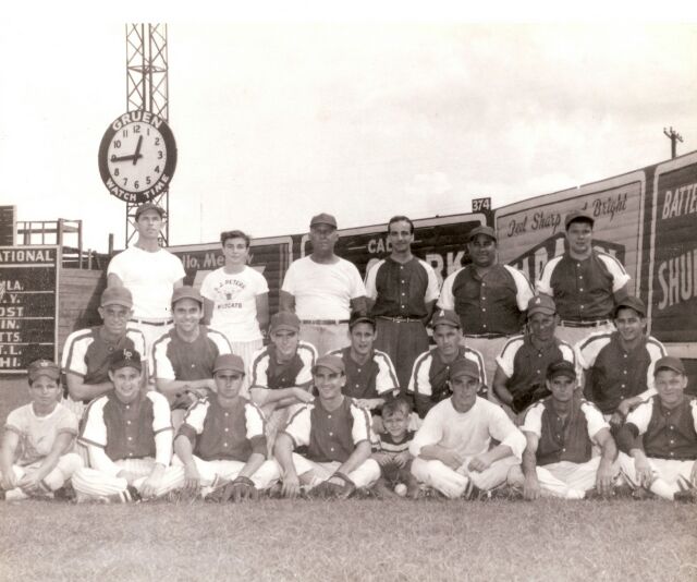 This picture of Carl Liller's team was taken at the Southern League Pelican Stadium in 1952. The team played against Lou "Rags" Scheuermann's All-American National Champions and defeated them in an exhibition game before the Major League played in the second game. Most of the young players were either drafted or enlisted in the service for the Korean Conflict. Pelican Stadium was torn down in the 70's and replaced by a hotel. Pictured are: 1st Row: ____, James Bullinger, Dennis Spellman, Joe Guiffria, Carl Liller, Jr., Louis Reynolds, ____, Pat Smith; 2nd Row: Jean Schaff, Harold Blaum, Mike Coleman, Fred Bullinger, Earl Smith, Jerry Swabell, John Patterson; 3rd Row: ____, ____, Dooley Ahten, coach, Carl Liller, Sr., owner of Carl Liller's Lounge, Buell Bourgeois, coach, Pat Bonner. |