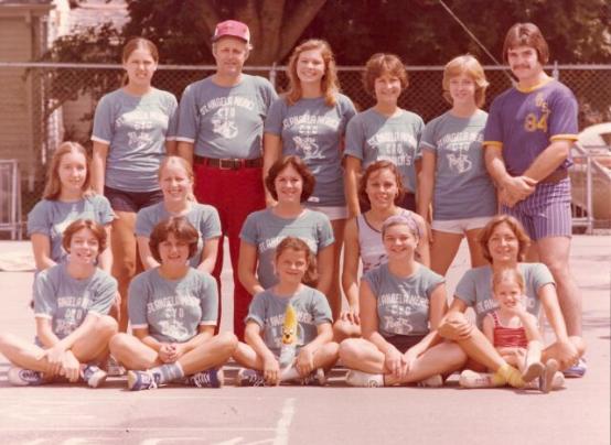 St. Angela's 1978 CYO Softball Team, runner-up in city tournament. Top row, left to right: Robyn Koppens, Fred Bullinger, Coach, Susie Guichard, Judy Cannella, Frannie Nicholini, Ronnie ___ Middle row: Robin Hood, Linda Hood, Linda Cunningham, Lisa Ragas Front row: Jeanne Sublette, Annette Bullinger, Tina Bullinger, Donna Martiny, Cyndi Diliberto, Cyndi's holding Kelle Hood, younger sister to Robin and Linda Hood. |