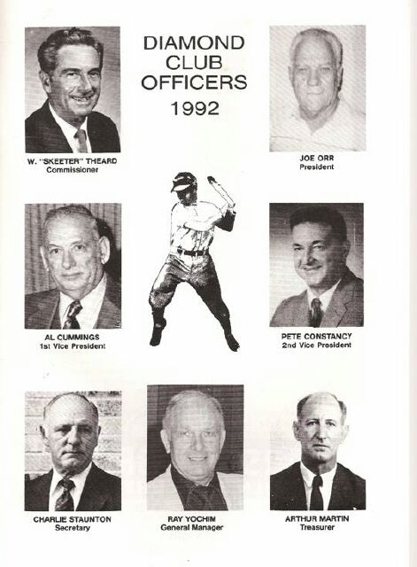 Diamond Club Officers, 1992: Joe Orr, President; Al Cummings, 1st Vice President; Pete Constancy, 2nd Vice President; W. "Skeeter" Theard, Commissioner; Ray Yochim, General Manager; Arthur Martin, Treasurer; Charlie Staunton, Secretary |