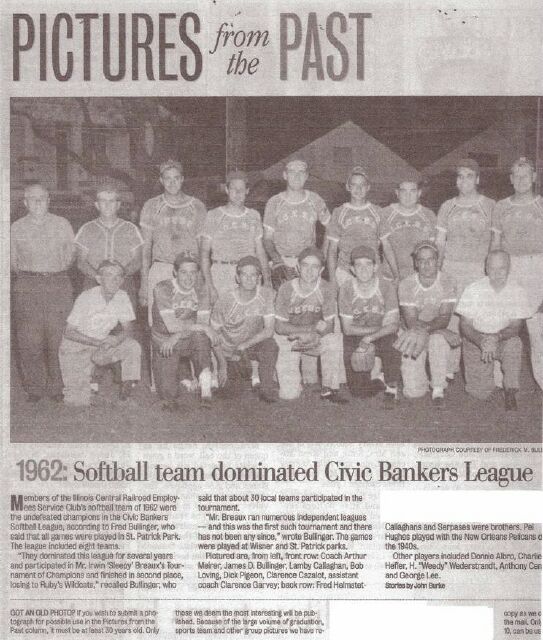 Illinois Central Railroad Employees Service Club 1962 team, undefeated champions of the Civic Bankers Softball League. The games were played at St. Patrick's Park. They dominated this league for several years and participated in Mr. Irwin "Sleepy" Breaux's tournament of champions and finished second place, losing to the Ruby's Wildcats. The Illinois Central New Orleans team had a home and home series each year with the Chicago team, which were also champions in their league. Pictured are, from left, front row: Arthur Meirer, Coach, James D. Bullinger, Lambert "Lamby" Callaghan, Bob Loving, Richard "Dick" Pigeon, Clarence Cazalot, Clarence Garvey, Asst. Coach From left, second row: Fred Helmstetter, Asst. Coach, John Callaghan, Joe Spano, Fred Bullinger, Ray "Moon" Serpas, Willie Cruze, Joe Matranga, James "Pel" Hughes. Not pictured are: Donnie Albro, Charlie Hefler, H. "Weedy" Wederstramdt, Emory Commier, Anthony Centanni and George Lee. |