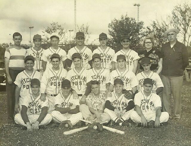 The Hitching Post semi-pro baseball team participated in the semi-pro baseball league at Audubon Park in 1950. Pictured above: First row, left to right: Billy Reynolds, Louis Reynolds, Larry Reynolds, Pat Smith and Joe Mock. Second row: Bill Bailey, Gasper Trapani, Earl Smith, Fred Bullinger, Rococ DeGeorge and J. Duffy. Third row: Joe McCarthy, Coach, Keke Foster, Jerry Swebell, Hal Gruthrient, Mike Coleman and Eddie Volpe, Mrs. May Bellone, owner of the Hitching Post, and Bill Reynolds, Coach. |