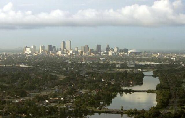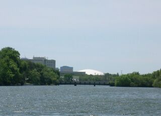 Modern day view of Bayou St. John; the Superdome can be seen in the background. |