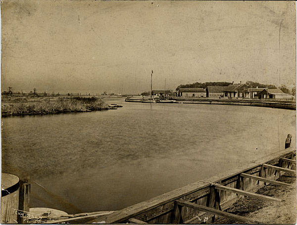 Boats docked on Bayou St. John at Spanish Fort Amusement Park; photo taken between 1890-1915. |