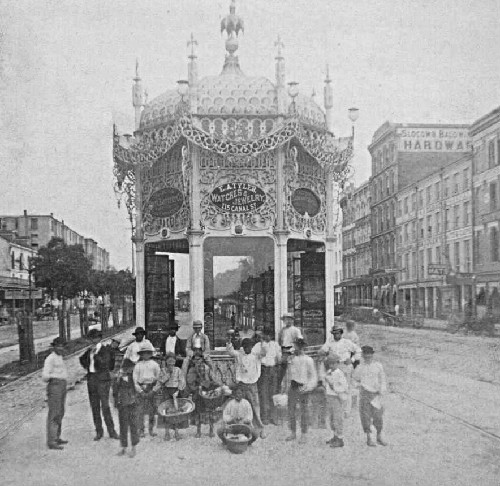 The Belknap Fountain was erected in the 1870's and sat on the neutral ground of Canal Street where Chartres meets Camp Street. Although it provided a fountain and animated display, its main purpose was advertising. The fountain was enclosed in an intricately designed cast-iron pavilion and contained a water-powered display of boats, cupids and swans. After dark, the display was illuminated by gas. Space in removable glass panels was purchased for advertisements. Some time in the 1890's, the structure was moved to City Park. |