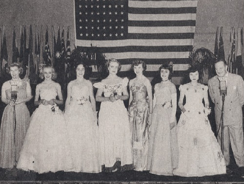 | Amanda Davenport Bullinger, September, 1949 - "These young lasses were judged the six prettiest 15-year-old girls in the New Orleans area in the local competition of a national contest sponsored on the occasion of the 15th anniversary of the Lux Radio Theater. Judging took place in the Roosevelt Hotel's Grand Ballroom. Emcees were Henry Dupre (right) and Jill Jackson (left). Girls are (left, from Jackson): Mae Cunningham, Patsy Stephens, Pat Sheppard, Patsy White, Dolores Cuccia and Amanda Davenport." |