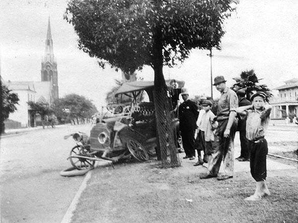 | Auto after an accident with a New Orleans Railway & Light Co. streetcar on Canal Street, across from Warren Easton School, 1914 |