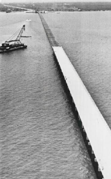 The current-day Causeway bridges stretch into the horizon. Midway, neither shore can be seen. In inclement weather, cars are led across the spans in convoys. |