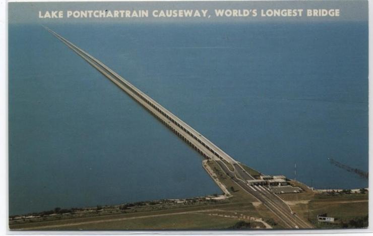 The Lake Pontchartrain Causeway, the longest highway bridge over water in the world at just under 24 miles, links Metro-New Orleans on the south shore of the lake (from Metairie in Jefferson Parish) with the town of Mandeville in St. Tammany Parish, on the north shore. The first span of the Causeway opened in 1956 and it was considered a remarkable feat of engineering at the time. During construction, pieces of the bridge were loaded on barges and towed to the spaces they were needed on the lake. The bridges are supported by 9,500 pilings, over 50 inches in diameter. They were the largest pilings ever driven at the time of the first bridge's construction. A second span was added in 1969, to make traffic on each span one way, making the Causeway much safer. Depending on the source, between 30,000-40,000 cars use the Causeway daily--most are commuters from homes on the north shore driving to Metro- New Orleans jobs. Lake Pontchartrain is the largest inland estuary in the United States, comprised of over 600 square miles. It was named for France's Minister of Finance, who served under King Louis XIV, for whom Louisiana was named. |
