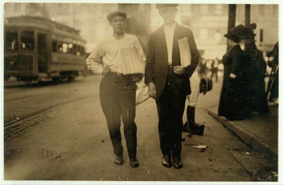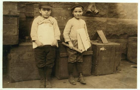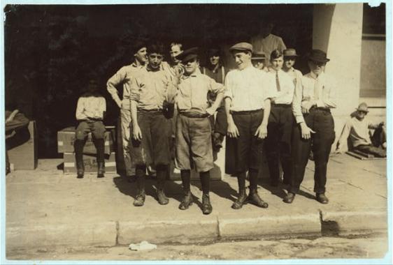 The newspaper sellers above were 7 and 9 years of age. New child labor laws had just come into effect and the photographer traveled to various U.S. cities to see if they were being respected by employers. The two above were the youngest children he found in any employ. The boys below were 12 and 13. The year was 1913. |