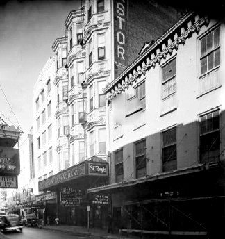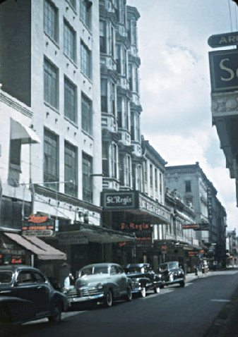 The building viewed from two directions, as it looked in the early 1940's. The bottom of "Hotel Astor" can be seen on the side of the building in the picture above. The St. Regis Restaurant occupies the ground floor. |