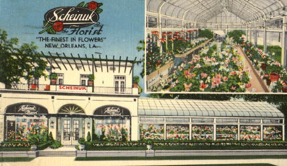 Many New Orleanians have fond memories of childhood visits to Scheinuk's on St. Charles Avenue, where every Spring, flowers shared space with lots and lots of real live Easter bunnies. Max Scheinuk built his florist shop, Scheinuk the Florist, in 1919, and the business remained open until 2003. Shortly after the building was sold, it was demolished to make room for luxury condominiums. I understand that Mr. Scheinuk's grandson is still in business as an independent floral contractor on the Northshore. The bunnies no longer make an appearance on St. Charles Avenue, but the childhood memories remain. |