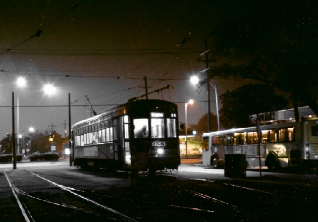 Carrollton Avenue at Claiborne Avenue, the terminus of the St. Charles streetcar line. I love this photograph. I don't know if it's because I love streetcars or because this is my old neighborhood, just a few blocks from the house on Belfast Street where I grew up. Or, maybe it's the nocturnal thing. Anyway, it's right up there with my all-time favorites. I wish I knew the name of the photographer and the date. |