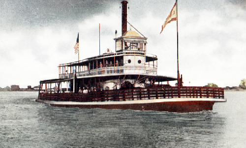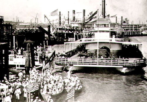 Ferry at the Canal Street dock, on the occasion of Pres. Theodore Roosevelt's visit in 1905. During his stay in the city, he was taken on an excursion boat upriver to Audubon Park and boats of all description crowded the river, filled with citizens anxious for a glimpse of the president, including the ferry boat pictured above.