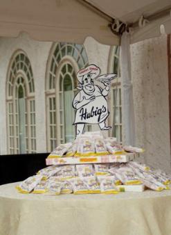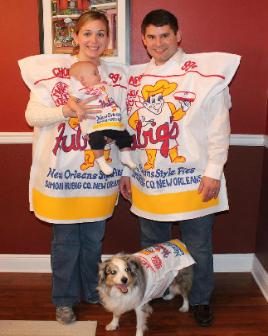 People in New Orleans take their Hubig's Pies seriously: left, a Hubig's Pies display at a wedding reception; right, Mardi Gras with Hubig's Pies costumes. |