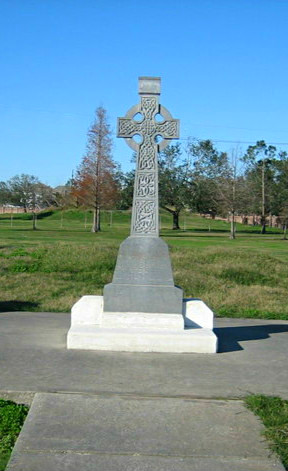 | It reads: "In memory of the Irish immigrants who dug the New Basin Canal, 1832-1838, this Celtic cross carved in Ireland has been erected by the Irish Cultural Society of New Orleans." |