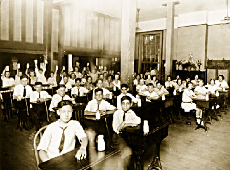 | In this photo, ca. 1920, boys & girls now share a classroom, but they're still divided into 2 sections of the room. |