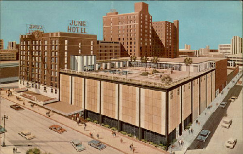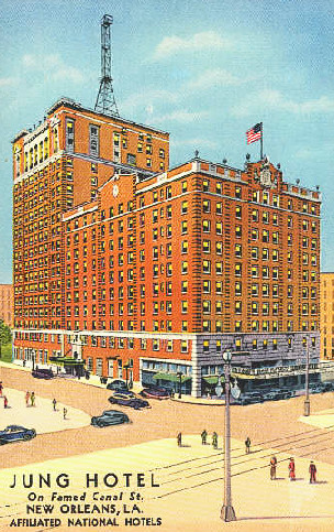 | The Jung Hotel, pictured above in 1939, first opened its doors in 1907 as the Hotel New Orleans. In 1920's, it became the Jung. Another section was added at that time and, then, in the 1960's, still another. At one time, it was labeled as the largest convention hotel in the South. It was called the Jung for more than 75 years and, afterward, it was known as the Clarion, Raddison and Park Plaza. It was heavily damaged in the levee failures of 2005 and remained closed for a long while. However, it was renovated and it's once again open as the Jung Hotel, a luxury hotel, offering both rooms and residences. |
