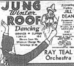 | Two Jung Hotel ads, ca. 1940's; above, Jung Winter Roof Dancing, featuring Jill Dean and the Ray Teal Orchestra. |