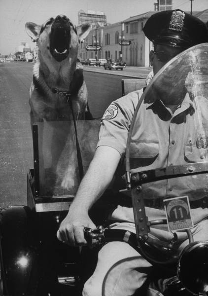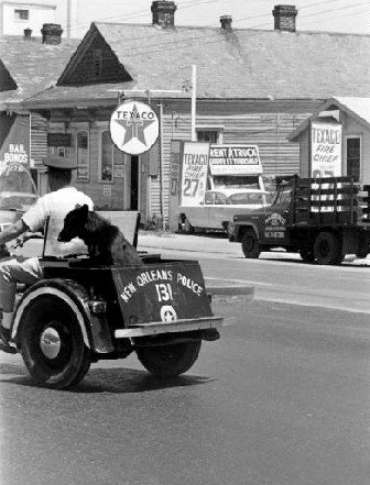 | New Orleans Police Officer and Friend, 1961 ~ ~ ~ I found the photo above in a 1961 issue of Life magazine. My e-friend and former NOPD officer, Bill Carter, did some sleuthing and asked a few friends and they came up with some names, for which I'm very appreciative. From Bill and his friend, Gene Fields, former NOPD officer (who, also, worked at the Jefferson Parish Sheriff's Office as head of the Detective and Investigation Bureau): "The photo above is of Howard Pittman and Jig. The names of some of the others who were part of the unit were: Jerry Salles, Albert Andry, Mel Koenegh, Jay Sedgebeer, Alan Hefker, Eddie McGhee and Alex Vega. The dog rode on a half sheet of plywood on the rear of the motorcycle. The motorcycle in this picture shows a little originality with the Plexiglas enclosure." |