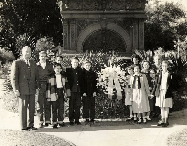 | Mary Olivier Thurman shared this 1954-55 school year photo, taken at the Gayarre Monument on Esplanade Avenue. On the far left, Gayarre school principal, Joseph Kluchin; boys, rear, from left: Sonny Evans, Felix Santos, Billy Everett and Santo Randazzo; Robert Wilson wears the plaid jacket. Girls, front, from left: Beth Ann Morvant, Loraine Savell, Mary Louise Olivier, Helene Powers and Betty Jean Miller; back row: Patricia Miller and Alma Fuxan, sixth grade teacher. |