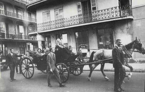 November 22, 1968: "Lady Bird Johnson and daughter, Mrs. Charles Robb, ride down Royal Street in the New Orleans French Quarter at dusk on Friday. Keeping in step with a horse named Napoleon are several secret service agents. New Orleans is the first stop of a four-day farewell journey around the nation for the First Lady." |