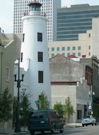I remember this building on Camp Street fascinating me when I was a child, always making me wonder how a lighthouse would wind up in the business district, with no body of water nearby. It still fascinates - and not just children. |