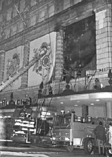 Left, Mr. Bingle on the MB building, Christmas, 1974; right, a fire at MB, 1968 |