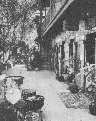 Above, Preservation Hall; above, right, the courtyard at 726 St. Peter in the 1930's. Below, left, Preservation Hall Jazz Band, early 1960's; below, right, stage of Preservation Hall.
