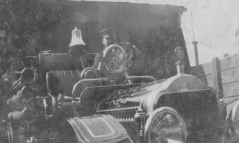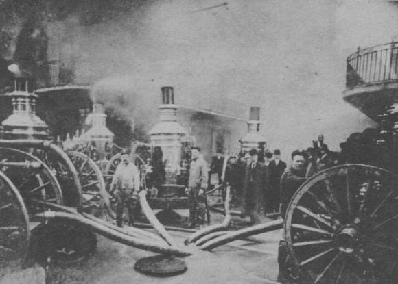 | Royal Street fire, engines pump from well at Bourbon and Iberville Streets. Stoker O'Brien stands next to the wheel at right. |