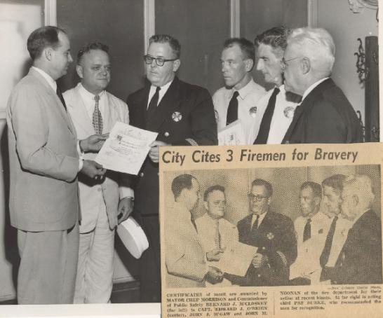 | "Certificates of merit are awarded by Mayor Chep Morrison and Commissioner of Public Safety Bernard J. McCloskey (far left) to Capt. Edward J. O'Brien (center), John J. McGaw and John M. Noonan of the fire department for their action at recent blazes. At far right is acting chief Pat Burke, who recommended the men for recognition." |