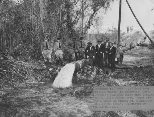 | "November 13, 1952 - Pipe from Dredge "Omega" in Industrial Canal flooding Seabrook tract (now Gentilly Woods) underground fire. This picture taken at France and Morrison Roads at the Levee. Requested by Mayor Morrison." |