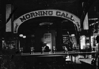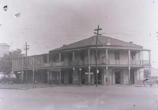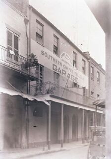 | Left, sign reads"Southern Coffee Mills Garage;" this company provided the coffee for the French Quarter's famous Morning Call, pictured above in about 1900. |
