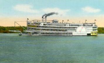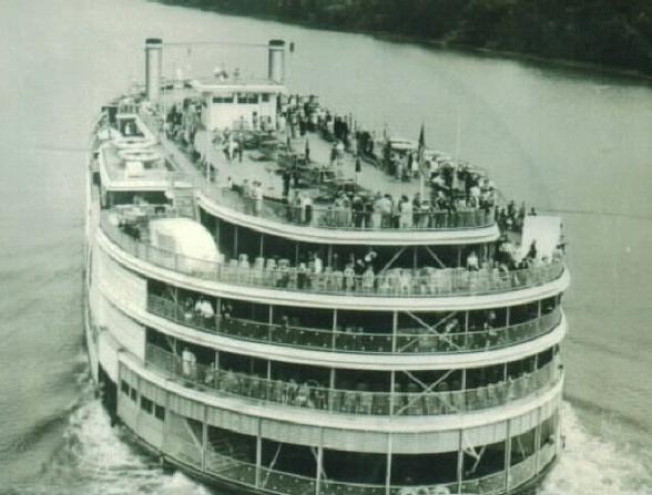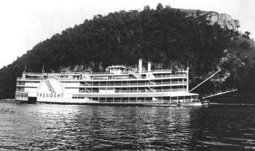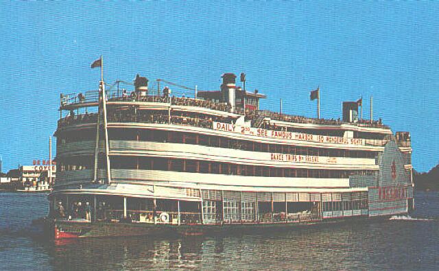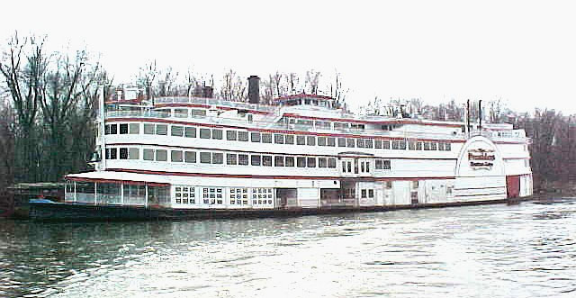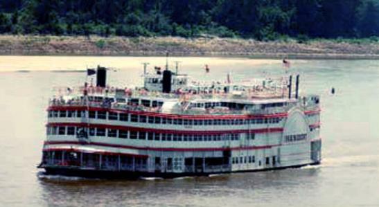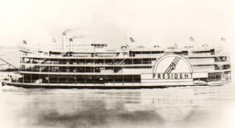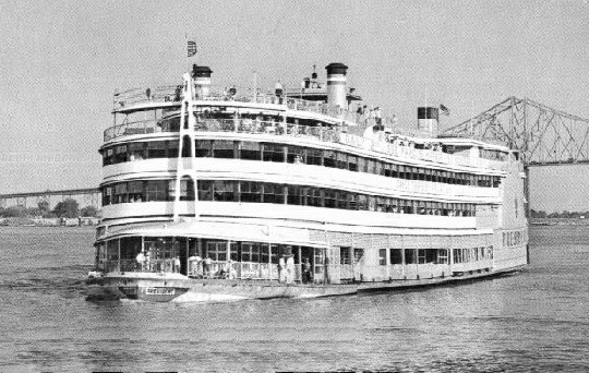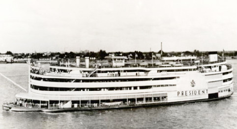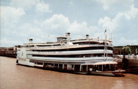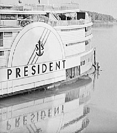 | Constructed and put into service in 1924, the Cincinnati, as she was originally named, was sold to Streckfus Steamers in 1933. After that, she was used as an excursion boat almost exclusively, with space for over 3,000 passengers. I haven't been able to find out when she came to New Orleans, but I remember that she was still in the city during the World's Fair in 1984. In 1981, she was sold to the New Orleans Steamboat Company (which also owned the Str. Natchez). A few years later, she was moved to St. Louis, MO and used there as an excursion boat until 1990. During her last years on the water, she was based in Davenport, IA and owned by the Isle of Capri Casinos. After she was decommissioned, she was moved to the Yazoo Diversion Canal near Vicksburg, MS, in 2001, and remained there until 2003, her fate very much in question. In 2003, she was put up for sale and moved to McKellar Lake, near Memphis, TN. In 2005, she was purchased by someone in Illinois and plans were made to convert her to a hotel and restore her to her former glory. I haven't been able to learn if these plans came to pass. Many New Orleanians have pleasant memories of the President---of afternoon cruises and moonlit dances on the Mississippi River. |