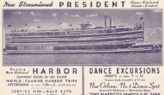 | "New Streamlined President, Glass-Enclosed, Steam-Heated World-Famous Harbor Trips, Afternoons, 2:30 - 5:00, $2.50, plus tax Servicemen Half-Rate; Dance Excursions, Nights 9:00 - 12:00, New Orleans No. 1 Dance Spot; Tony Almerico's Famous 11-pc. Band" |