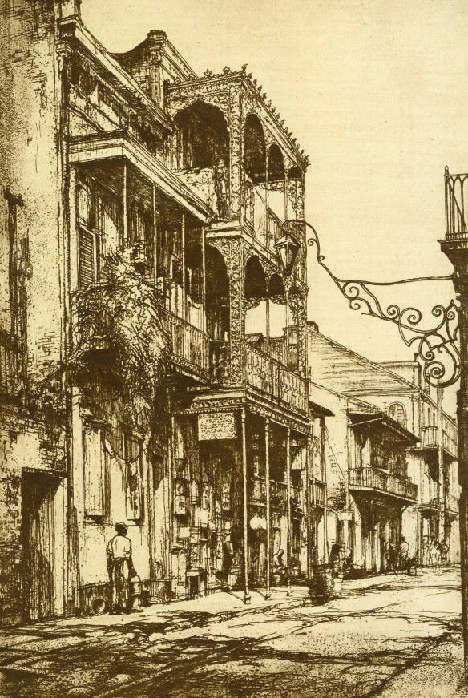 | There was a note accompanying this sketch: "Done by George Horter, 1923." But it's likely the artist was Earl Horter, a well-known sketch artist who did several scenes in the French Quarter. |