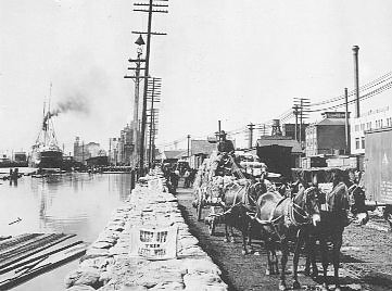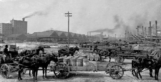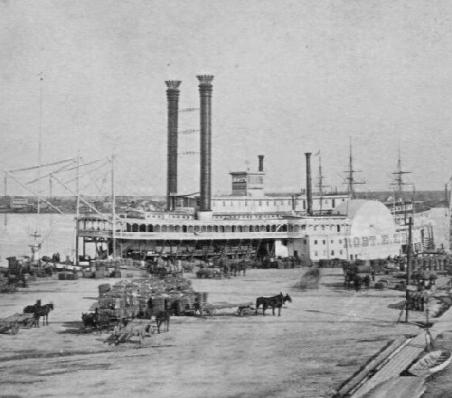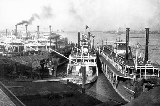 | Sugar storage sheds can be seen at left, at right, steamboats lined up along the wharf. |