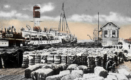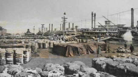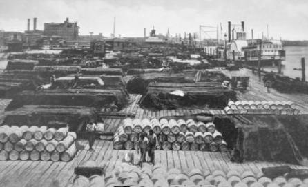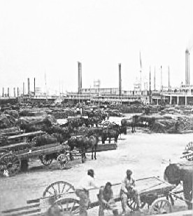 | Above, sugar waiting to be loaded; below, steamboats lined up to be loaded with cotton. |