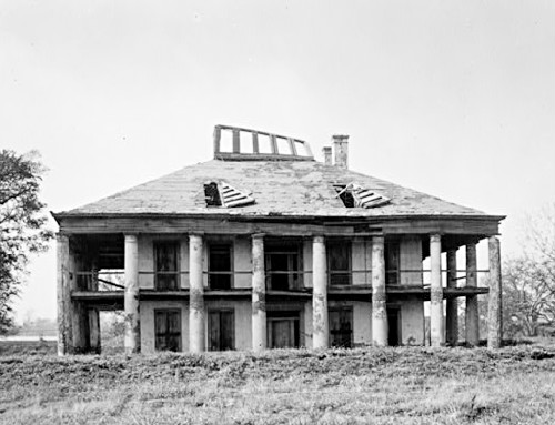 "Seven Oaks, neglected by its railroad company owners, is rapidly crumbling to ruin, surrounded by huge black oil tanks and the remnants of its once beautiful oaks. Once the residence of a wealthy sugar planter, Camille Zeringue, a descendant of one of New Orleans' first settlers. |