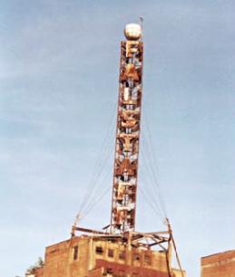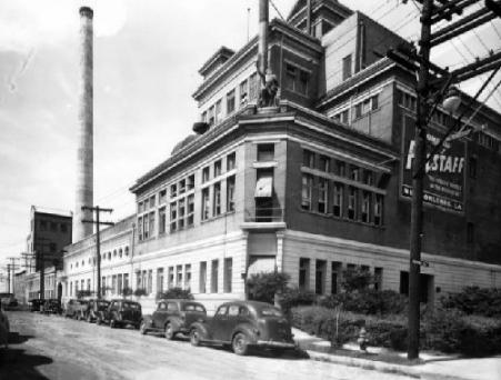 | Above, Falstaff Brewery, Tulane Avenue, 1939; the tall Falstaff sign, shown in the photo on the right, was used in the brewery's heyday to forecast the weather. The neon letters would be illuminated in various patterns to forecast changes in temperature. A weatherball was added in 1952 and its color would change to indicate weather conditions. The brewery had been abandoned for 3 decades, the towering sign rusting into decay, when the complex was rescued and renovated in 2006; it's now the Falstaff Apartments. A second phase of development is underway, it includes rebuilding of the old Beer Garden. And, happily, the old Falstaff letters (or reasonable facsimiles) now shine once more in the night sky. |